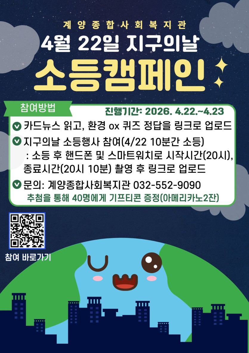 안녕하세요 계양종합사회복지관에서는 지구의날을 맞이하여 환경문제의 심각성을 알리고 지역주민에게 환경보호활동 실천을 독려하고자 소등캠페인을 진행하려고 합니다.