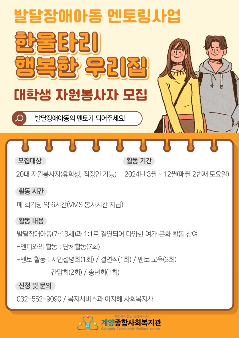 발달장애아동 멘토링사업 '한울타리 행복한 우리집' 대학생 자원봉사자 모집
