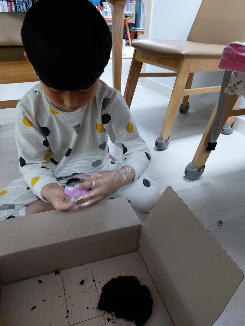 아이는 너무 신기한 나머지 '흔히 볼 수 있는 커피 찌꺼기도 반죽을 하면 이것처럼 점토가 될 수 있을까?' , '어떻게 이 화분에 색깔이 칠해지지?' 등등 여러가지 생각을 하느라 처음엔 웃음기 하나도 없이 심각한 표정으로 활동에 임하여 저는 새삼 아이가 자랐구나를 느끼게 된 시간이었습니다. 적힌 설명서를 보며 스스로 물도 부어보고 직접 반죽을 해보며 물을 조금씩 더 추가해가며 열심히 점토를 만들어 보고 이제 다 됐다며 뿌듯해 하는 모습이 대견하기도 하고, 모양틀로 찍어낸 반죽도 말리면 색깔을 칠할수 있을지 궁금해하고 재활용 상품에 대해 얘기도 나눠보게 된 아주 뜻깊은 체험활동 이었습니다~ 소중한 시간을 가지게 되어 너무 감사드립니다^^