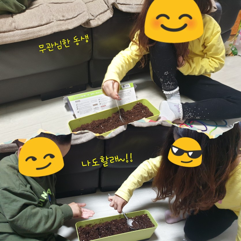 첫째 아이는 저를 따라 상추를 심었는데 둘째는 관심없는 척 하더라구요. 소파에 누워 힐끔거리더니 결국은 합류했어요. 둘이 같이 씨앗을 심고 물도 주었어요. 지금은 상추가 싹이났어요!