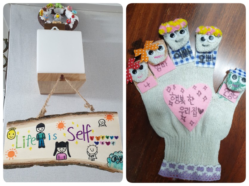 만들기를 좋아하는 둘째는 손가락얼굴장갑과 문패를 정성들여 꾸몄답니다. 문패는 우리집 두 번째 가훈~ "인생은 셀프"입니다. ㅋㅋ