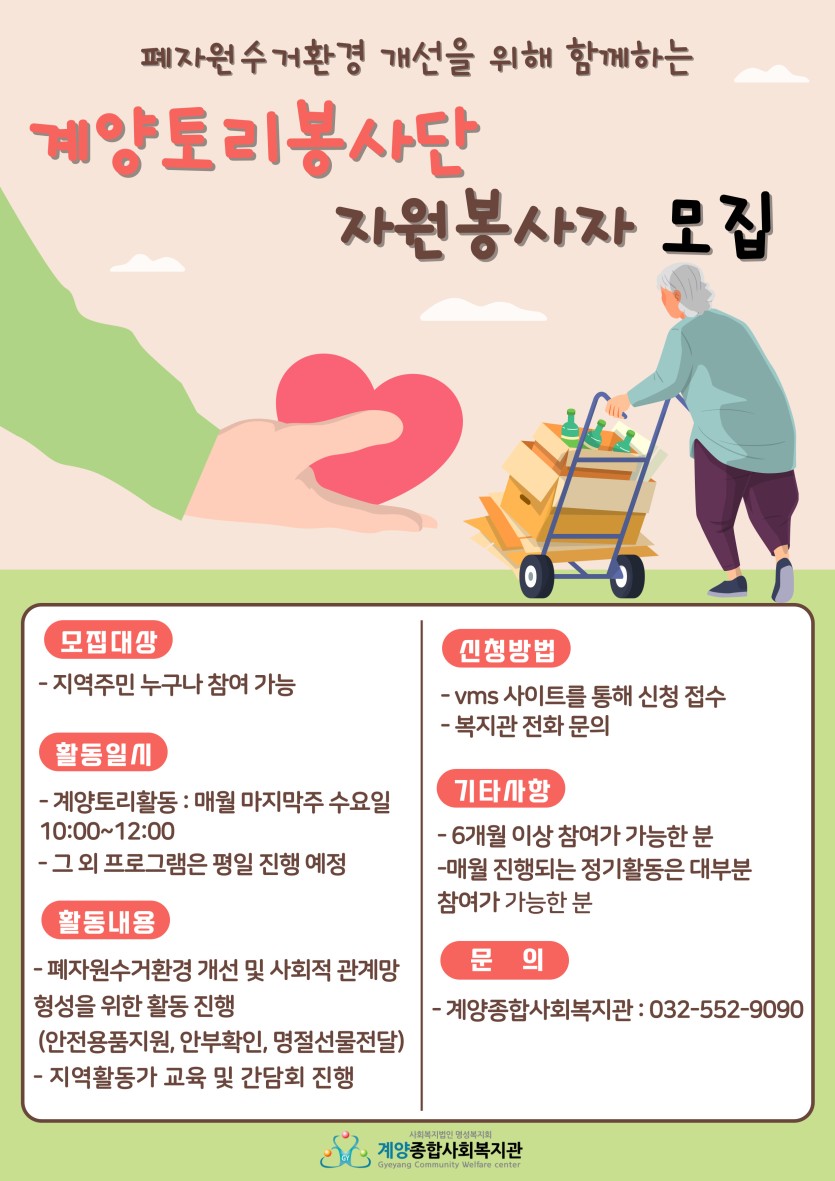 폐자원 수거어르신을 지원하는 계양토리봉사단 지역활동가(자원봉사자)모집[모집마감]