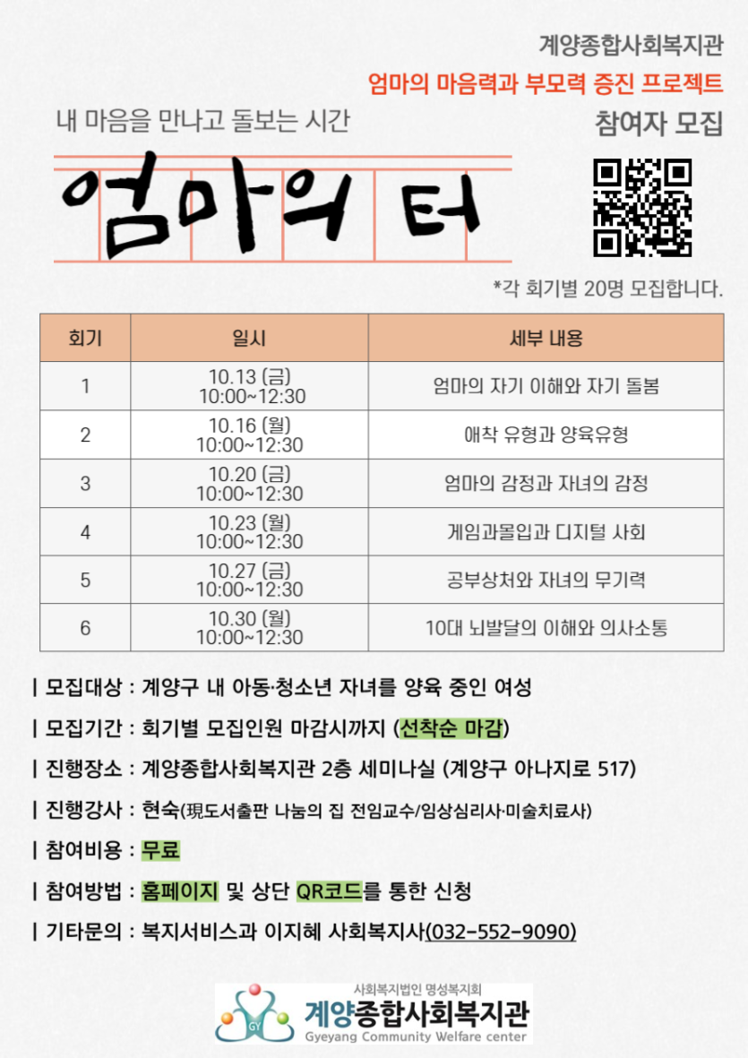 계양종합사회복지관에서는 계양구 내 아동, 청소년 자녀를 양육 중인 어머니를 대상으로