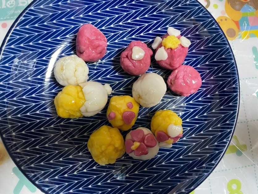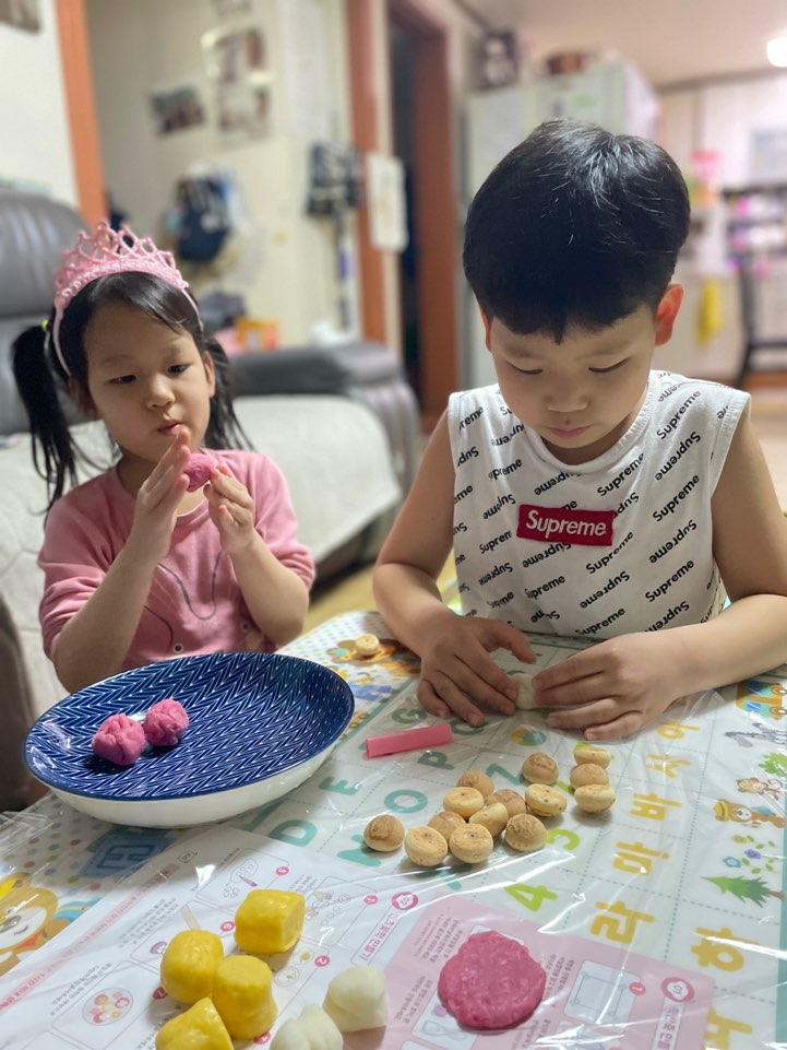 아이가 셋이라 아빠도 함께 온가족 5명이서 노랑, 분홍. 하얀색의 예쁜 반죽을 만들고,