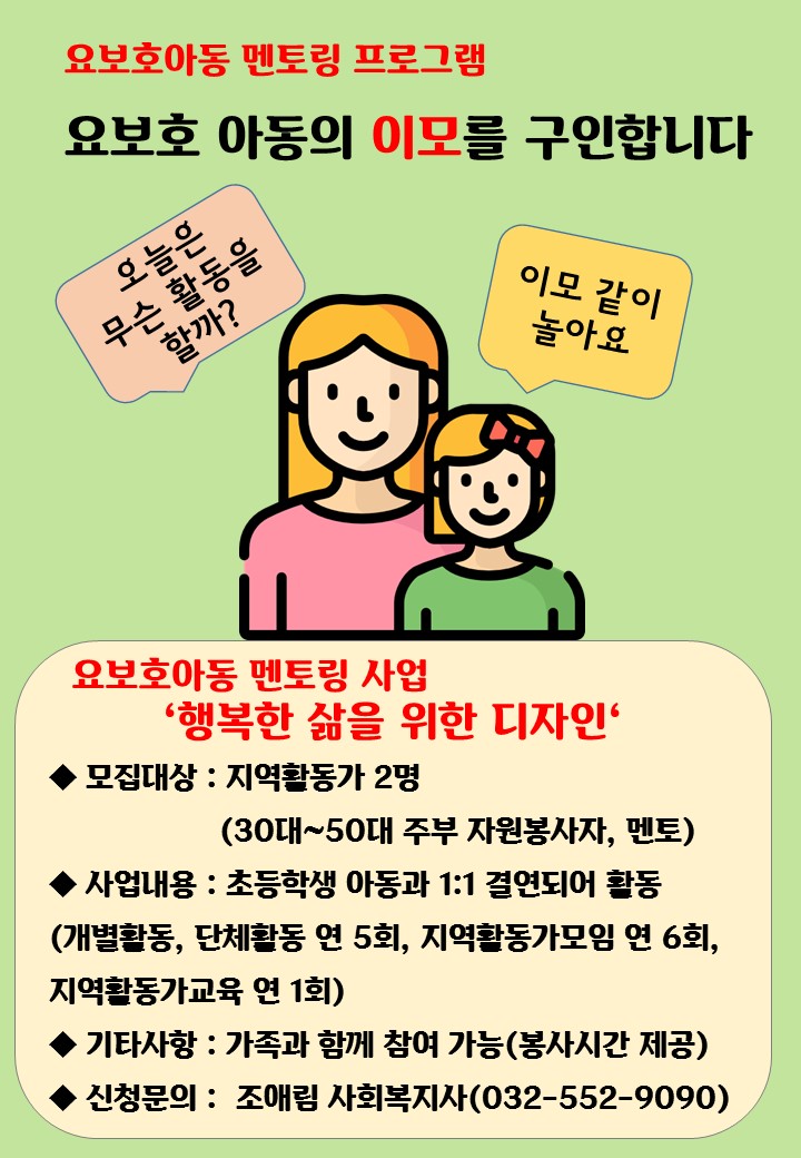 -모집대상 : 아이들을 좋아하고 정기적인 활동이 가능한 30대~50대 주부 2명(선착순마감)